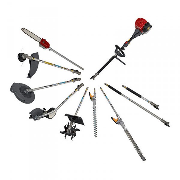 Faites votre choix parmi 2 moteurs et 9 accessoires interchangeables : débroussailleuse, élagueuse, 2 taille-haies, 2 extensions, souffleur, coupe-bordure et sarcleuse.