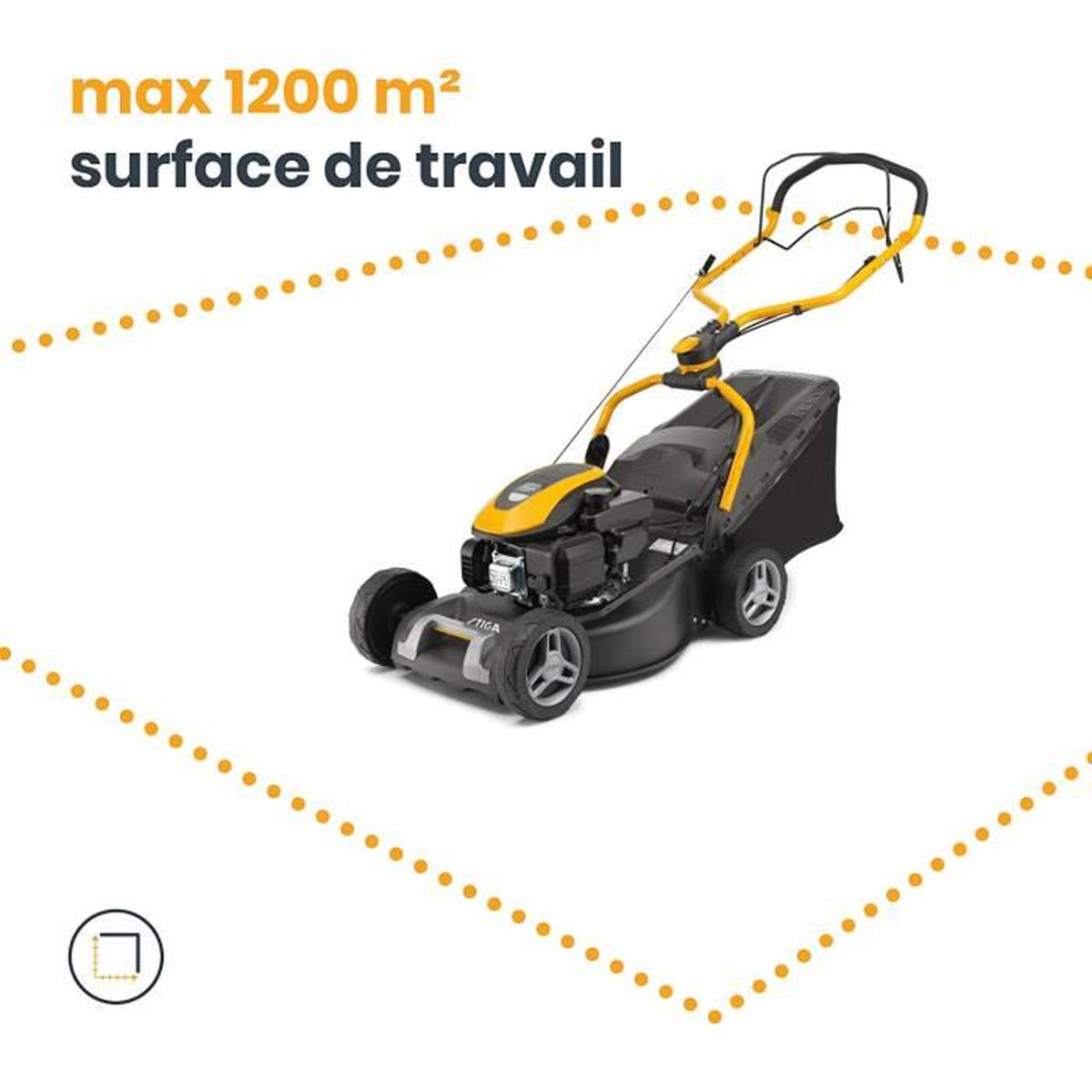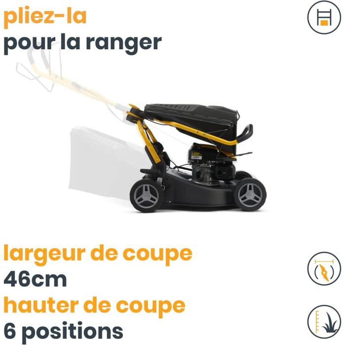 Tondeuse haute performance, Adapté aux travaux longs et exigeants – Poignée ergonomique innovante réglable en hauteur et en inclinaison pendant la coupe, Guidage par traction – Largeur de coupe 46 cm, Deux modes de coupe (ramassage et éjection arrière), Hauteur de coupe réglable en 6 positions (22-65 mm) à l aide d une poignée – Moteur à cm3, Puissance 1900 W, Démarrage par tractio